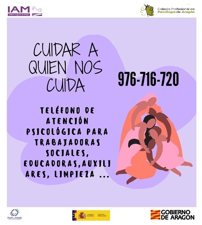 - Cuidar a quien nos cuida. Teléfono de Atención psicológica para trabajadoras sociales, educadoras sociales, auxiliares, limpieza. (IAM y Colegio Profesional de Psicología de Aragón)